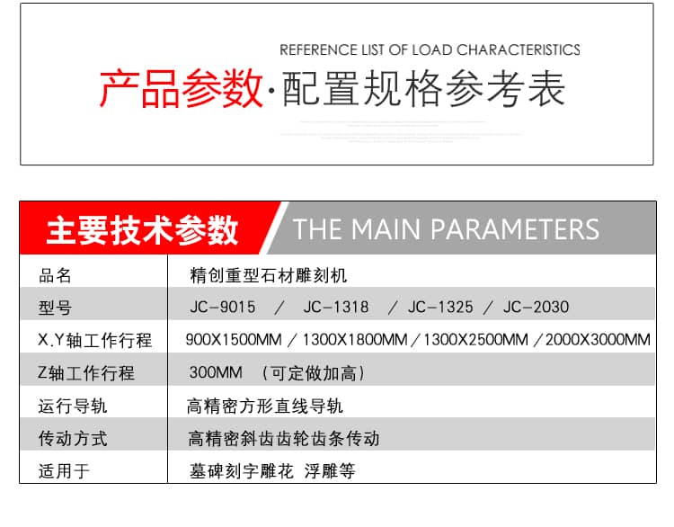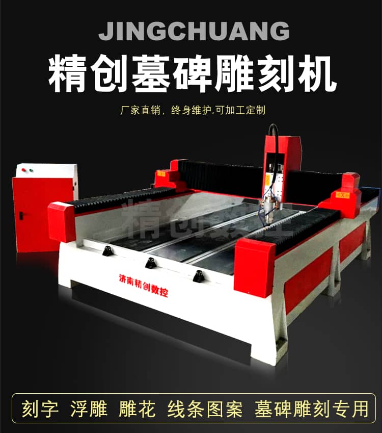 整机尺寸:1300*2500*300mm适用范围 天然大理石、花岗石、青石、砂岩、人造石、墓碑、里程碑、瓷砖、地板砖、金属、玻璃及硬质物体材料的三维浮雕及线雕、切割、倒边、钻孔、二维雕刻。性能优势 ◆床身采用厚壁钢管焊接而成,经高温回火处理,确保机身变形小,刚性好,强度大。 ◆Y轴采用双电机驱动,精选配对,确保运动平稳。 ◆采用高精级齿轮齿条传动,精度高,速度快,力量大。 ◆机电全优设计,精选各种电气配件,将故障率降到最低。 ◆全部防尘防水设计,全方位保护机器传动部件 ★长时间工作:可实现断电、断点、隔天加工,方便省力。采用对断点记忆方式,保证可在意外(断刀)或隔天情况下加工。 ★高速度加工:高动能、Y轴双电机驱动,曲、直线速度一致。独特的多个工件加工原点的保存方式。问题在哪里,我们的技术人员就在哪里!