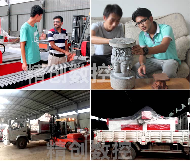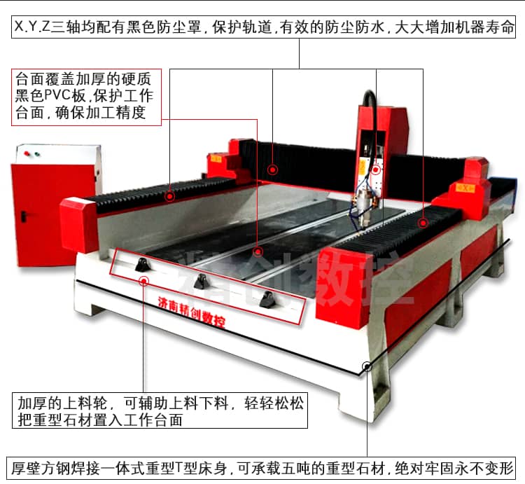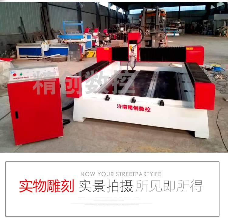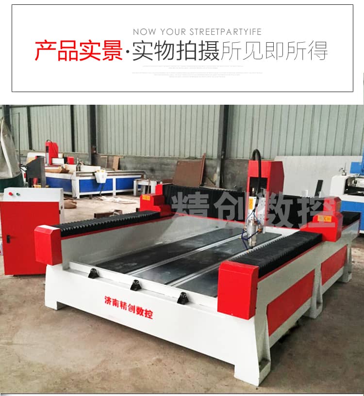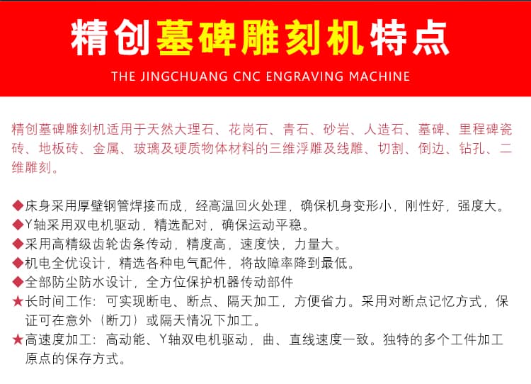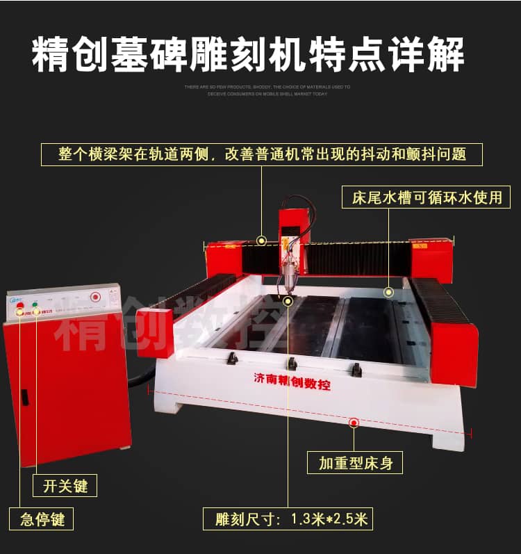 整机尺寸:1300*2500*300mm适用范围 天然大理石、花岗石、青石、砂岩、人造石、墓碑、里程碑、瓷砖、地板砖、金属、玻璃及硬质物体材料的三维浮雕及线雕、切割、倒边、钻孔、二维雕刻。性能优势 ◆床身采用厚壁钢管焊接而成,经高温回火处理,确保机身变形小,刚性好,强度大。 ◆Y轴采用双电机驱动,精选配对,确保运动平稳。 ◆采用高精级齿轮齿条传动,精度高,速度快,力量大。 ◆机电全优设计,精选各种电气配件,将故障率降到最低。 ◆全部防尘防水设计,全方位保护机器传动部件 ★长时间工作:可实现断电、断点、隔天加工,方便省力。采用对断点记忆方式,保证可在意外(断刀)或隔天情况下加工。 ★高速度加工:高动能、Y轴双电机驱动,曲、直线速度一致。独特的多个工件加工原点的保存方式。问题在哪里,我们的技术人员就在哪里!